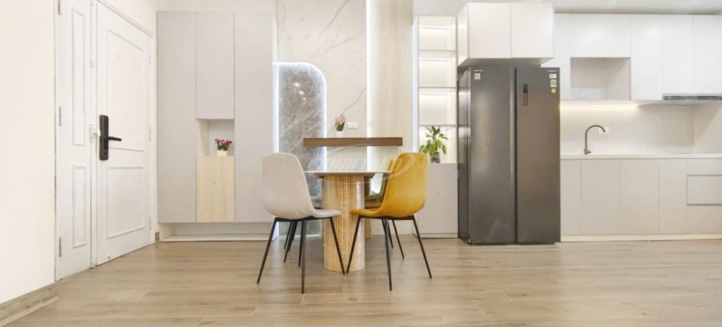 Không gian phòng khách liền bếp được bố trí hài hòa, tạo cảm giác rộng rãi, hiện đại, phù hợp xu hướng sống của cư dân mới. Ánh sáng tự nhiên chan hòa giúp không gian luôn thoáng đãng, điều hòa không khí tốt và tiết kiệm điện năng.