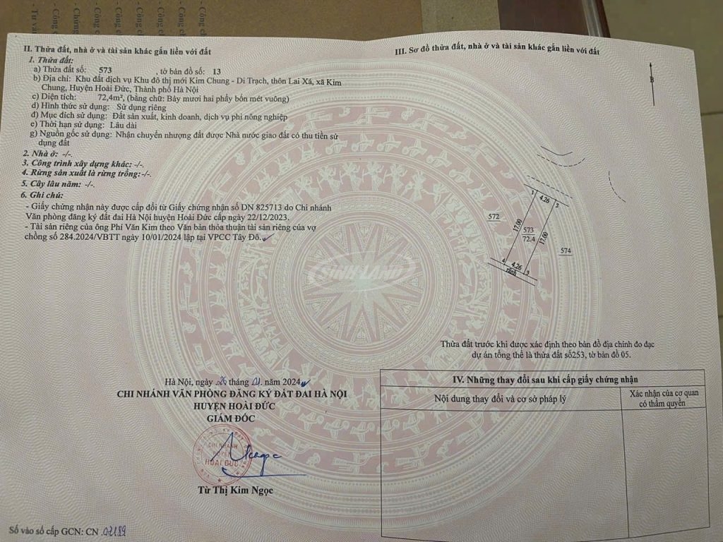 Mảnh đất thuộc khu đất dịch vụ Kim Chung – Di Trạch, đã có sổ đỏ riêng từng thửa, Nhà nước giao đất có thu tiền sử dụng đất, thời hạn sử dụng lâu dài.