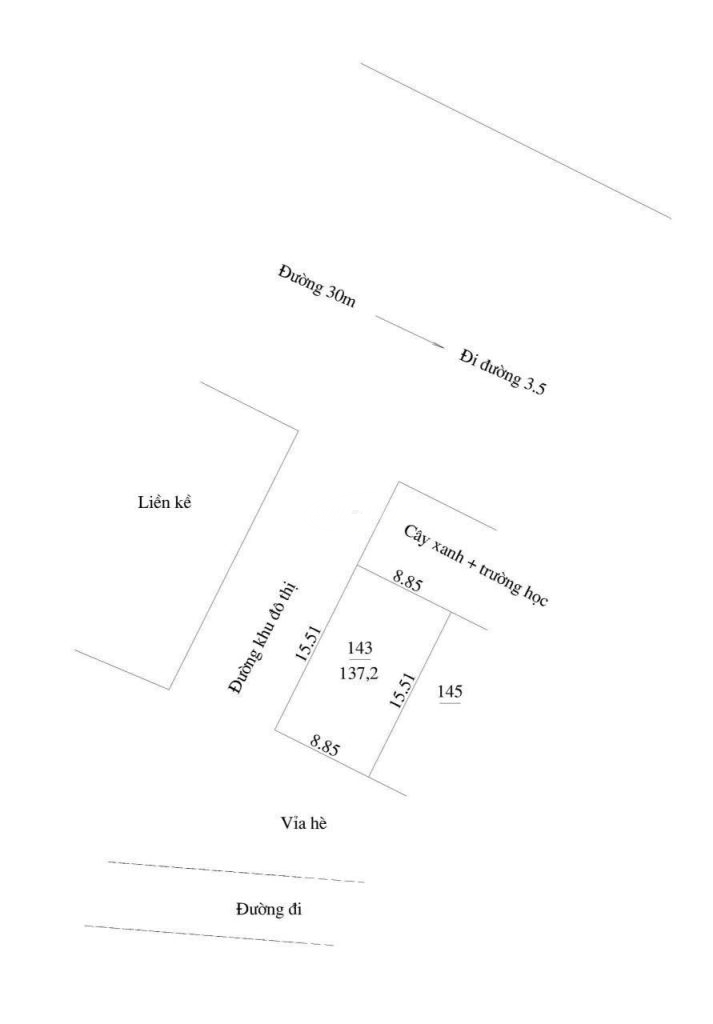 Lô góc 3 mặt thoáng, diện tích 137,2m² (8,85m x 15,51m).