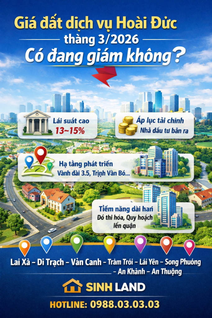 Theo khảo sát thực tế từ sinhland.com.vn, giá đất dịch vụ Hoài Đức tháng 3/2026 có xuất hiện một số lô giảm nhẹ khoảng 5–8 triệu/m², chủ yếu do nhà đầu tư cần bán nhanh trong bối cảnh lãi suất ngân hàng tăng cao.